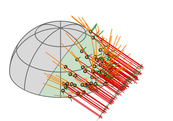 A hemispherical mirror reflects parallel rays uniformly and within a spherical cap